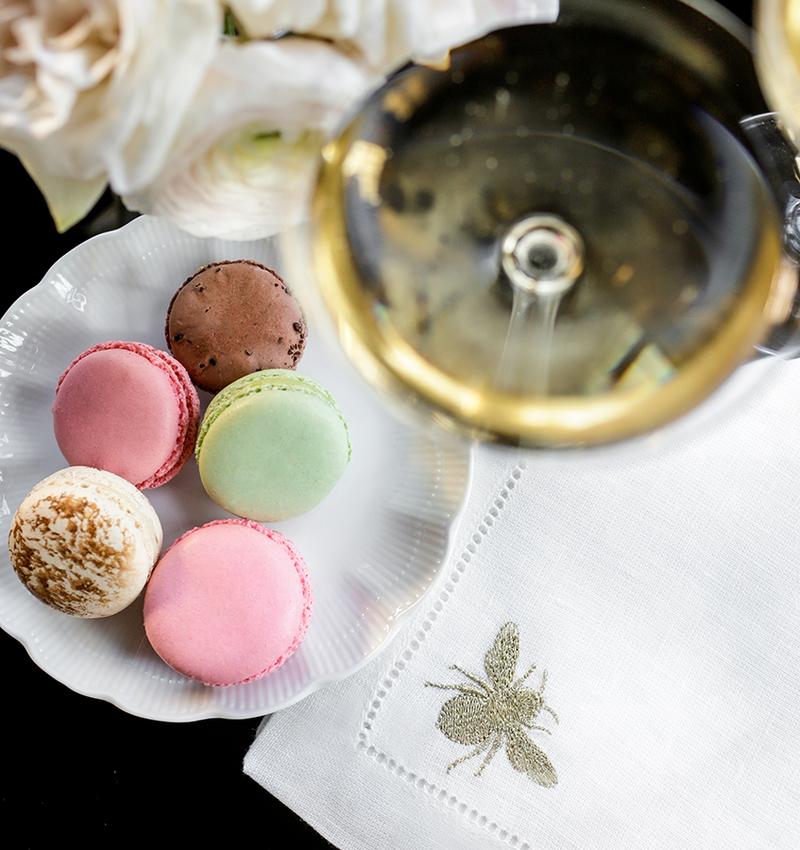 Bombo features a beautiful gold metallic bumblebee embroidered against white hemstitched linen. Bombo reinvents the art of entertaining with elegance and chic glamour. Finished with a hand-drawn hemstitch and mitered corners.