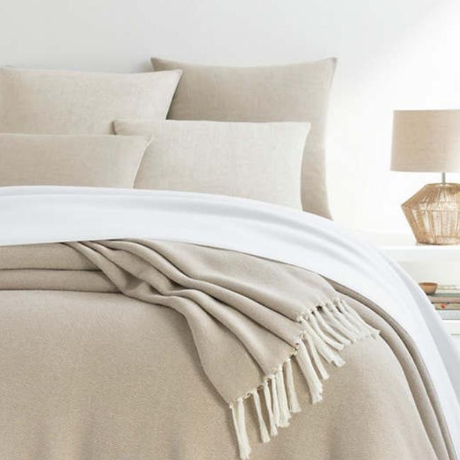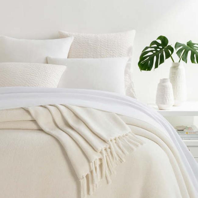 A soft and snuggly addition to the perfectly layered bed, our pure cotton Logan Blanket has a float stitch weave for extra insulating qualities. With a knotted self fringe along the width edges, it can make a bold and sophisticated bohemian texture statement. In Dove White or Sand.