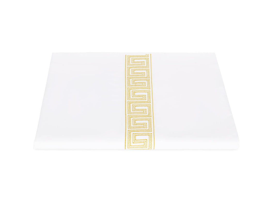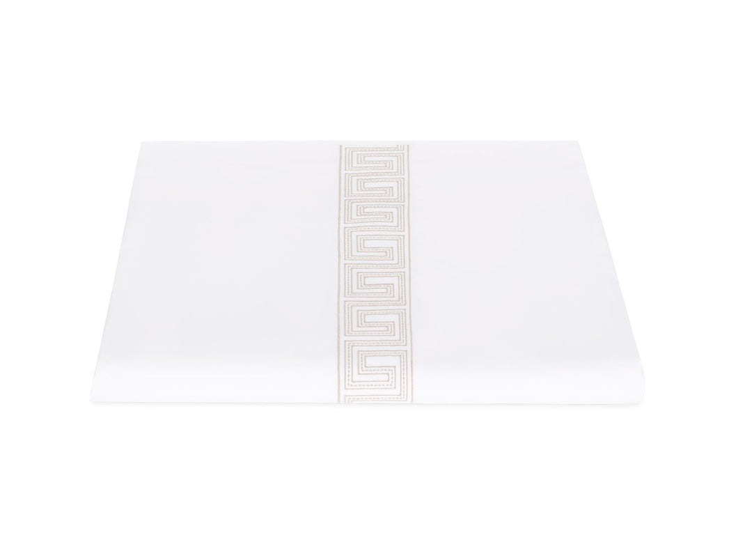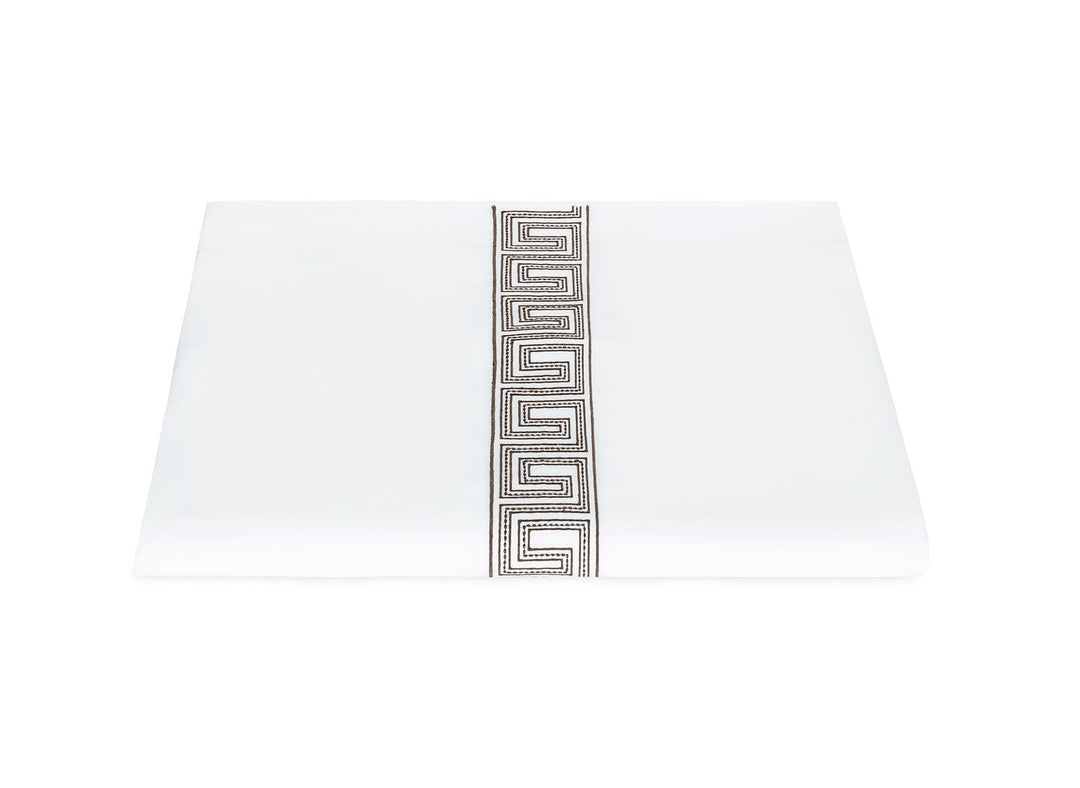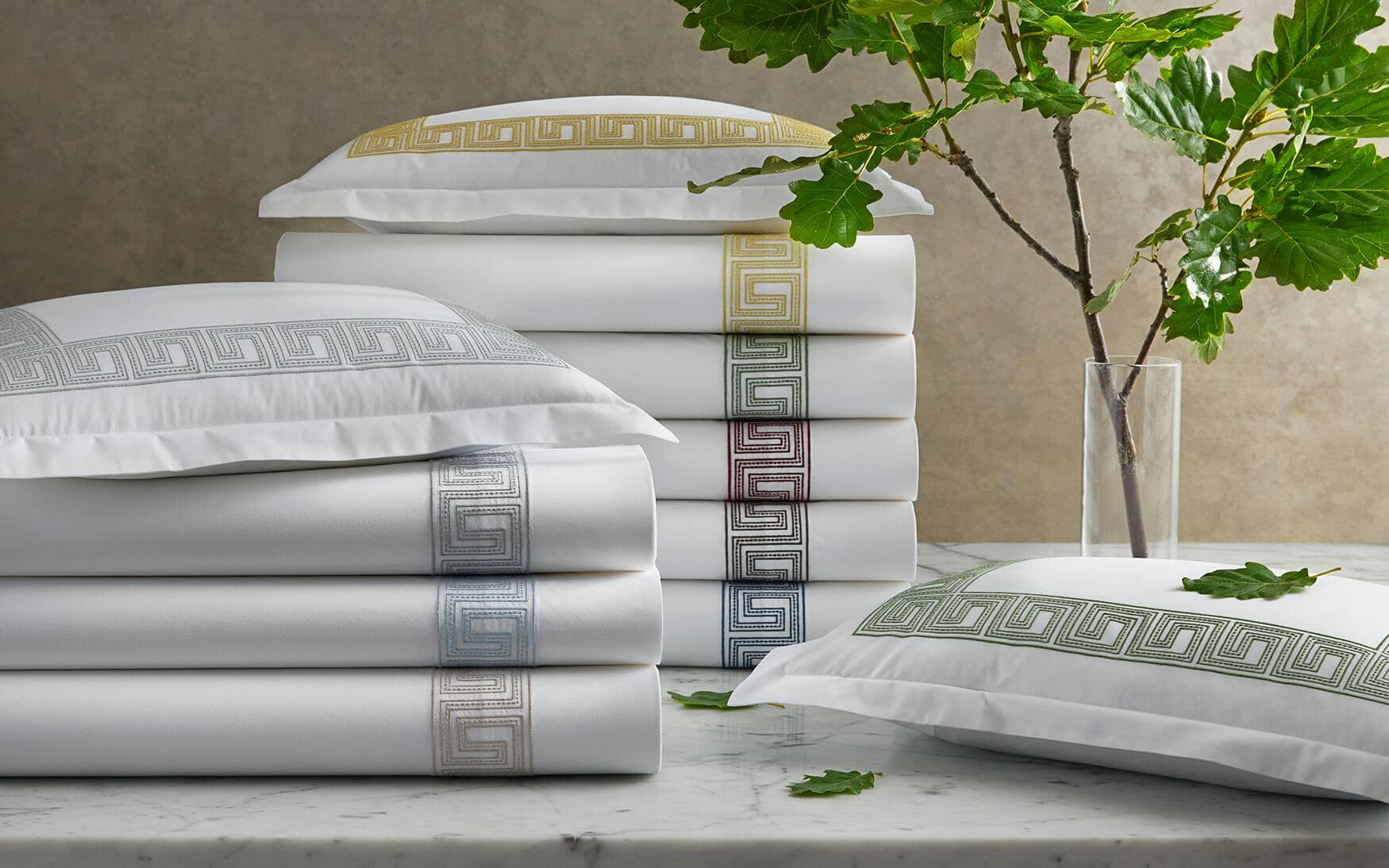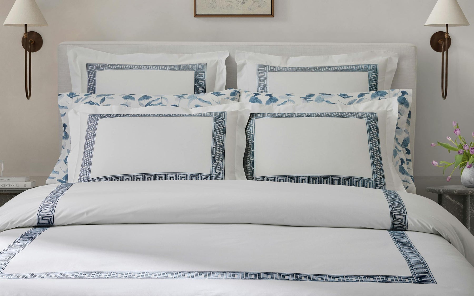 Inspired by an intricately beaded Schumacher tape, our boldly embroidered Ophelia collection embodies a traditional Greek key pattern with a bespoke sensibility. In 520 thread count Ceylon sheeting, it’s a playful, exuberant take on a traditional motif.