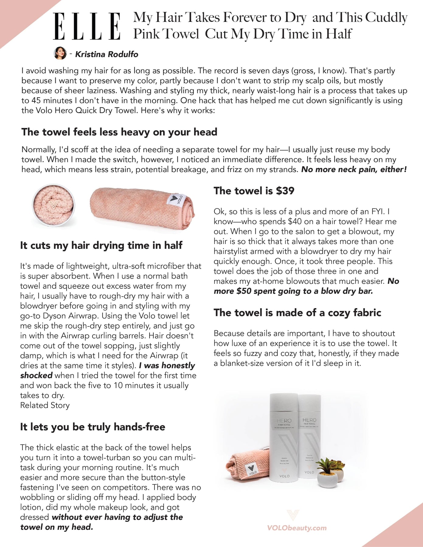 The VOLO Hero Hair Towel: your hair's ultimate savior and a time-saving solution. Our meticulously designed towels feature an exclusive Nanoweave™ fabric—a unique fabric providing cloud-like gentleness and exceptional absorbency. A two-time winner of Allure's Best of Beauty award, the Hero is carefully crafted to leave your hair beautiful, healthier, and free from frizz. It's an innovative creation you'll love.
