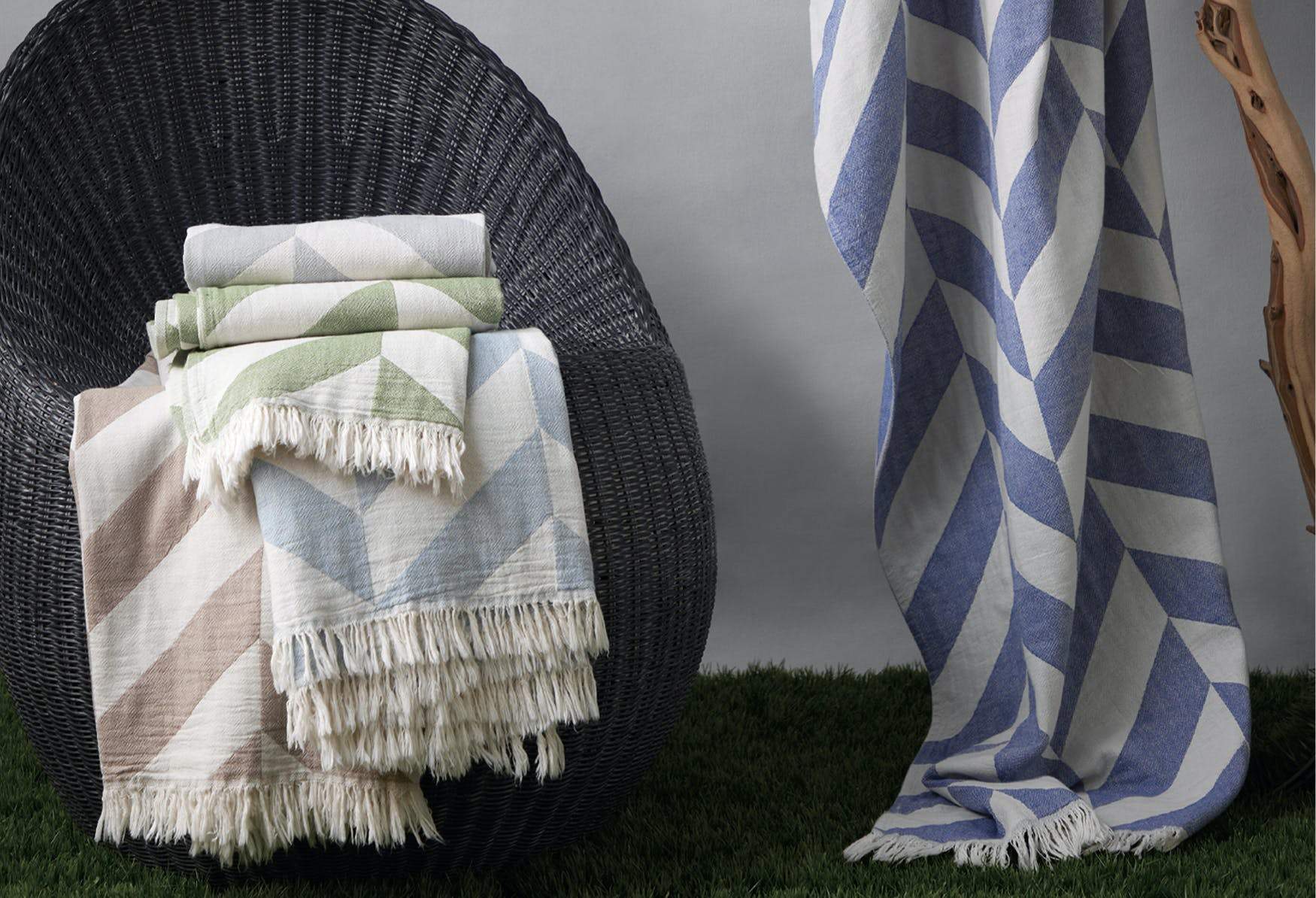 The Paros beach towel is woven from pure cotton in the style of a traditional Fouta, originally used in the Turkish baths for its lightness, absorbency and fast-drying qualities. With a stand-out geometric chevron pattern, Paros is simply finished with fringed edges.