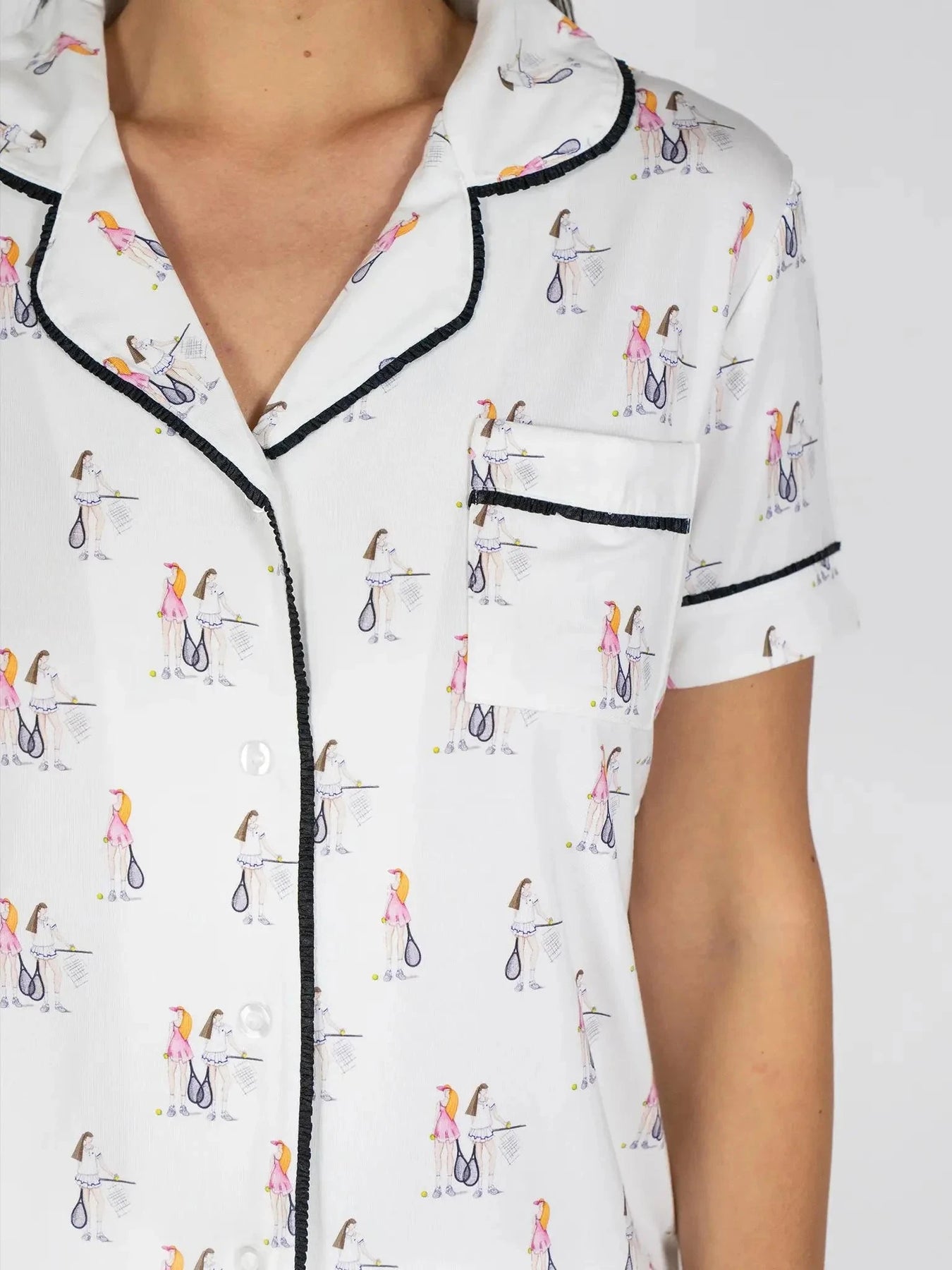 Jolene Short Pajama Set in Tennis Print features a hand-drawn tennis-inspired design on crisp ivory, accented with black ruffled piping. The button-down top has short sleeves, a roomy fit, and classic notch collar. Mid-rise shorts offer a longer fit with a soft elastic waistband for comfort. Made from breathable, OEKO-TEX® certified bamboo fabric with thermoregulating and moisture-wicking properties for year-round luxury lounging.