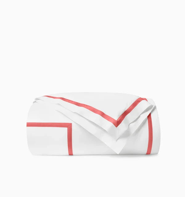 The understated sophistication of Estate's crisp white, Italian-woven long-staple cotton base is an immaculate backdrop for lustrous sateen appliqué detail, beautifully bordering this collection to create a sense of tailored elegance.