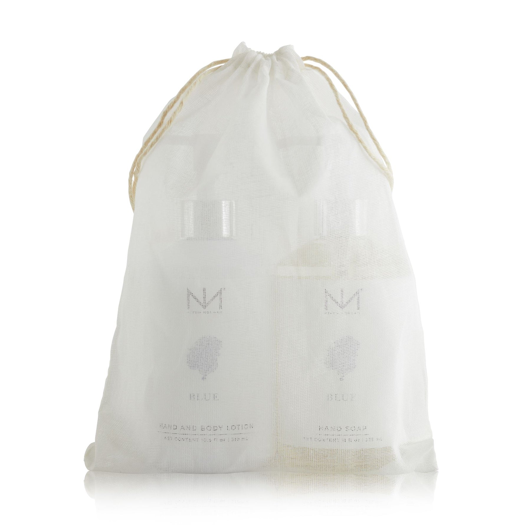 Indulge yourself or a loved one with our Blue Soap and Lotion Set. This elegant set features a luxurious hand soap and hand lotion, beautifully packaged in a white sheer cotton drawstring bag. Perfect for gifting, it's ready to elevate any bathroom or kitchen with its sophisticated and exclusive touch. Treat yourself to a touch of luxury today.
