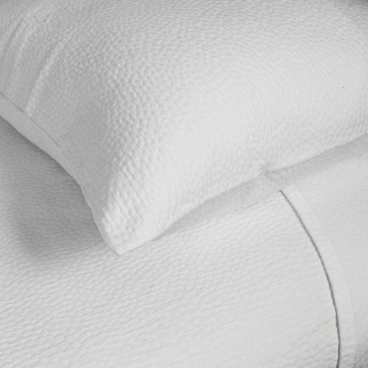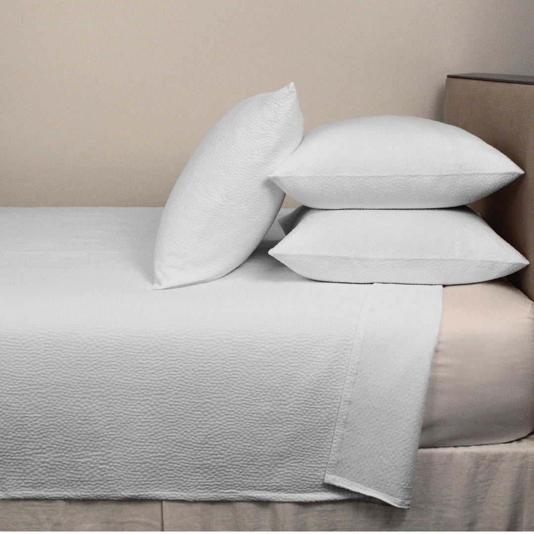 Lightweight cotton matelassé has a modern pebble pattern. Set includes coverlet and 3 euros, queen set includes coverlet and 2 euros.