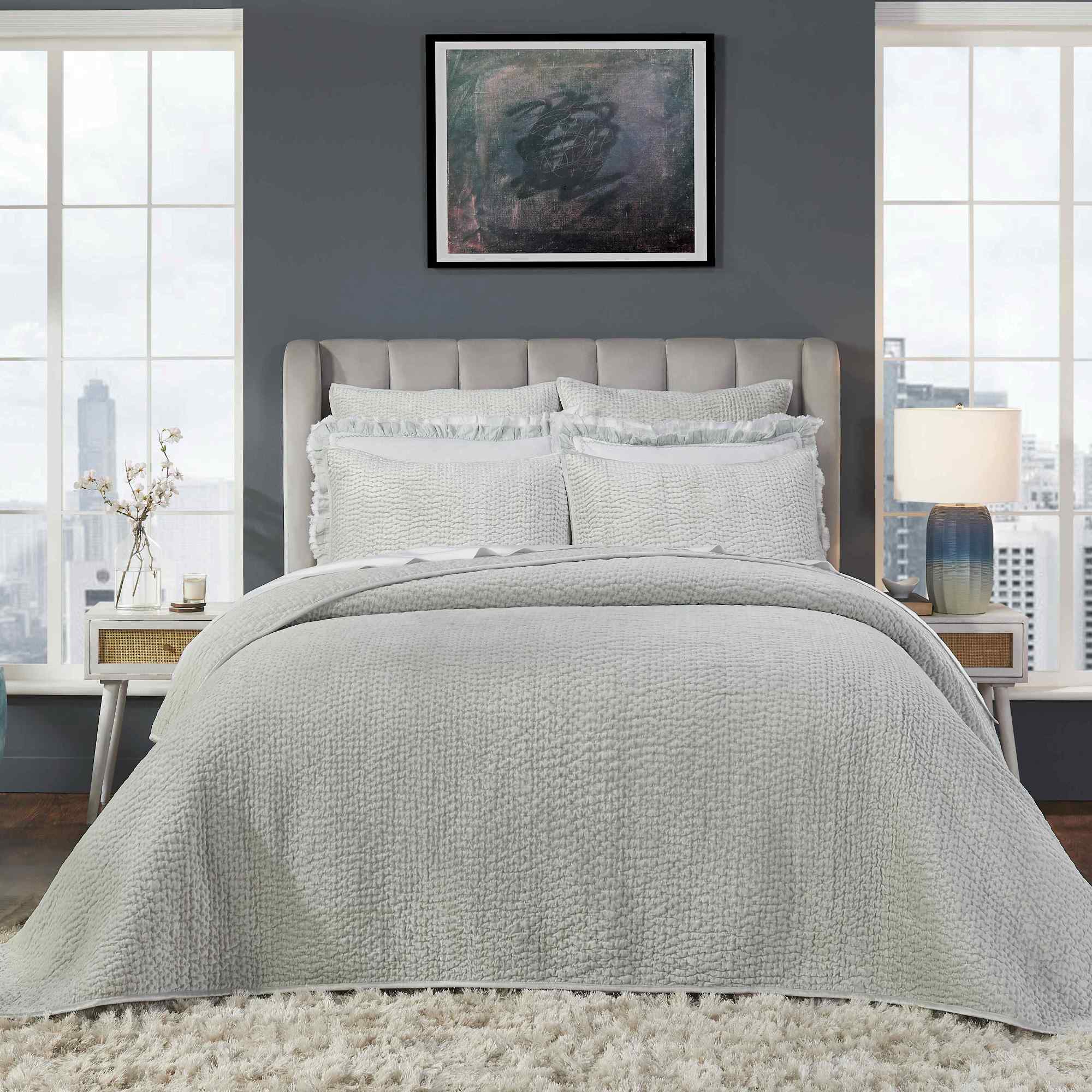 Lush and warm, our luxe cotton viscose velvet Laguna coverlet and shams offer an enveloping comfort and ultra-softness with a refined finish. It is reversed with 300 thread count cotton sateen, for smooth contrast to the lustrous velvet on the front.