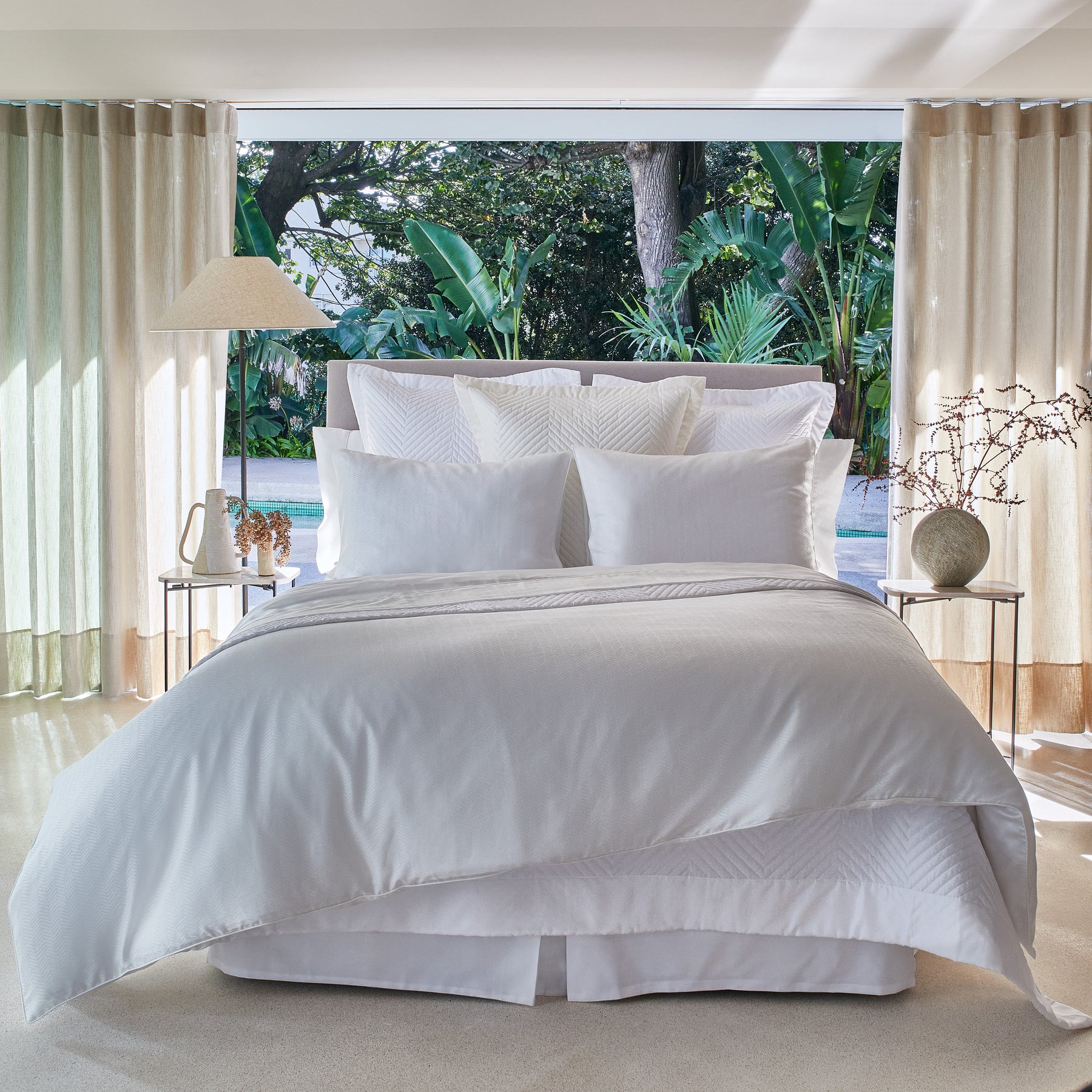 Olivia is available in duvet covers, shams and sheet sets. Duvet covers and shams in jacquard fabric, front and back. Flat sheet and pillowcases in plain pearl fabric with jacquard border. Fitted sheet in jacquard fabric.