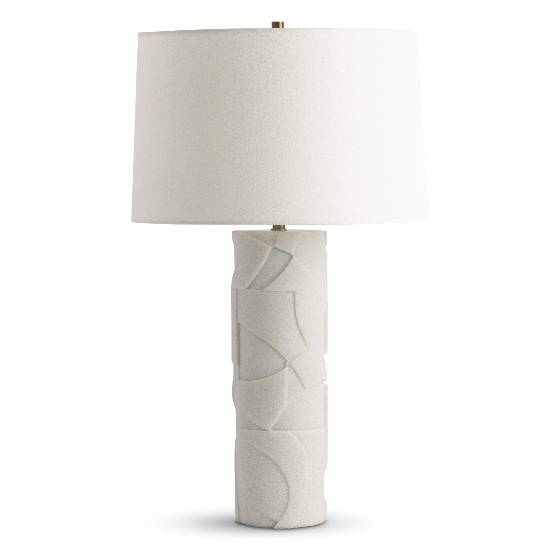 Introducing the Bettona Table Lamp - the perfect blend of art and function. Its cylindrical base boasts an abstract geometric relief, while the composite stone construction in ivory and antique brass hardware exudes luxury. Complete with a tapered drum shade, this lamp makes a stylish statement in any space. A small handling fee may apply to this fragile item.