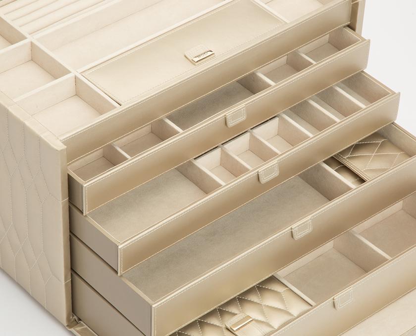 • Storage: 43 jewelry compartments, 4 watch compartments, 4 ring rolls, jewelry roll (2 compartments, 10 earring holes, 3 necklace holders, and 1 ring strip) and travel case (3 compartments and 4 ring rolls)