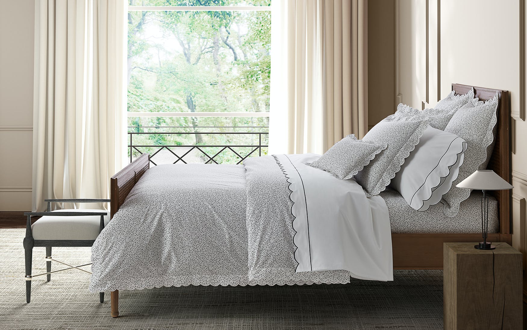 Chic and charming Celine features the painterly dots of the classic Duma from Schumacher. This collection is available in 5 graphic colors that stand out against the white background of 500 thread count Luca. Finished with an embroidered scalloped edge in matching color.