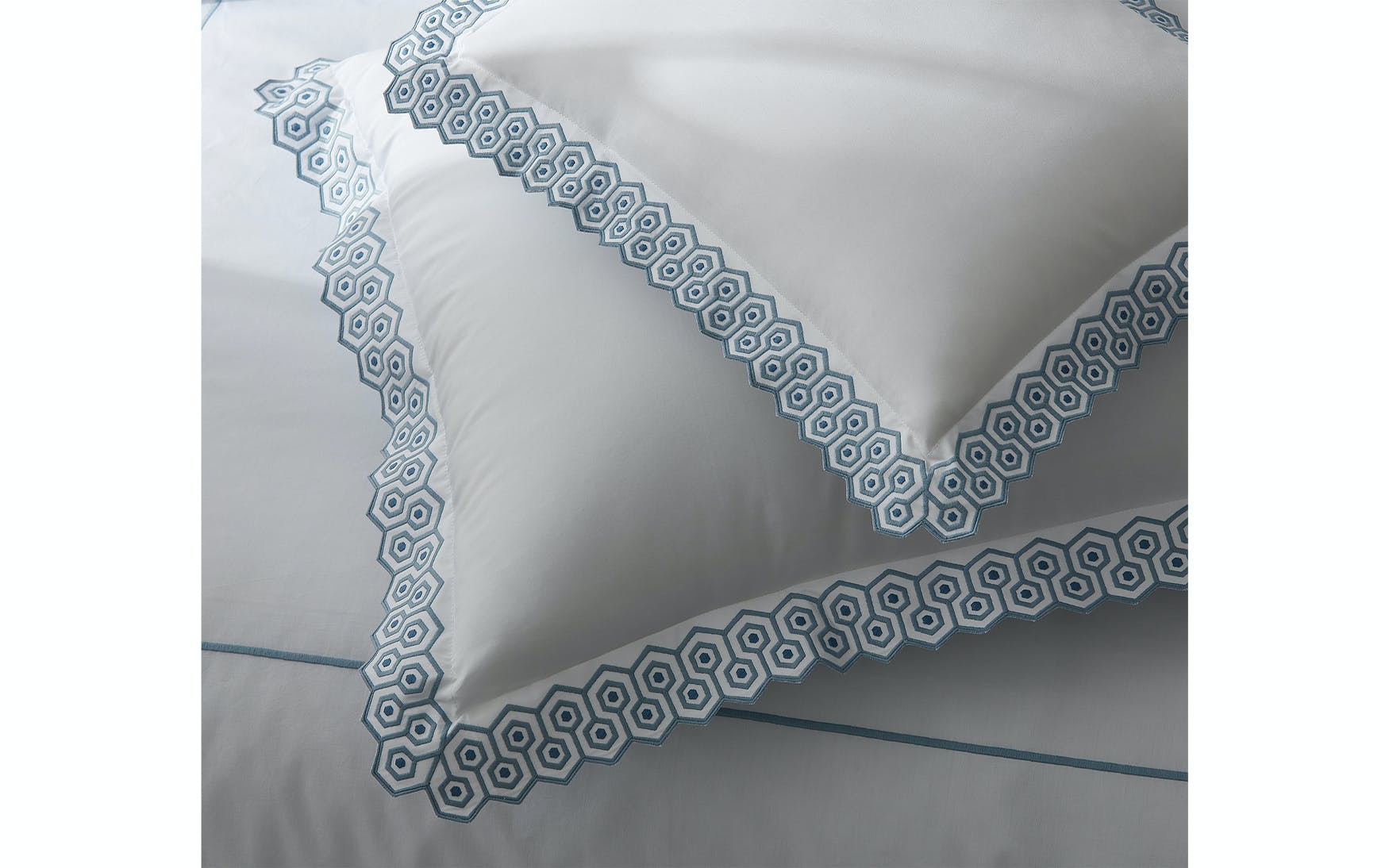 Felix rings together the craftsmanship comfort and beauty for which Maotuk is known. The artisanal embroidery of a two color interlocking honeycomb pattern enlivens their luxurious 600 thread count Milano Egyptian cotton, making Felix a visual and tactile delight. Available in five vibrant colors, an elegant satin stitch frames the top of the duvet cover.