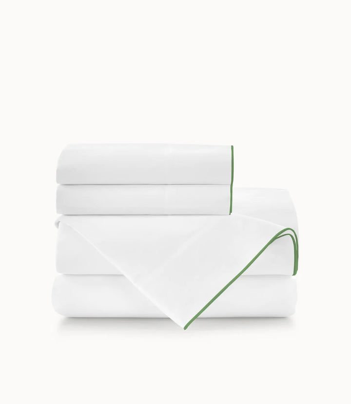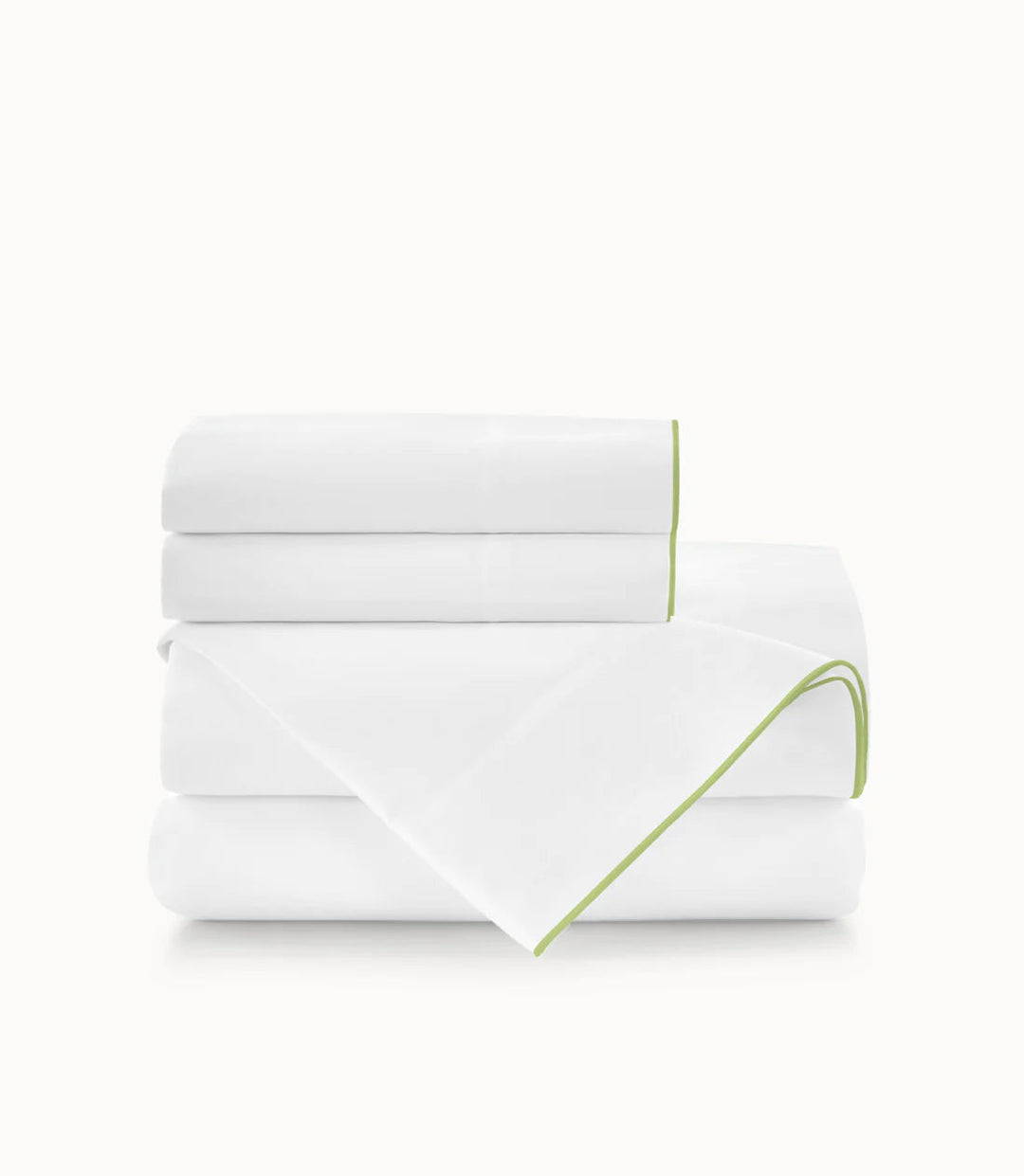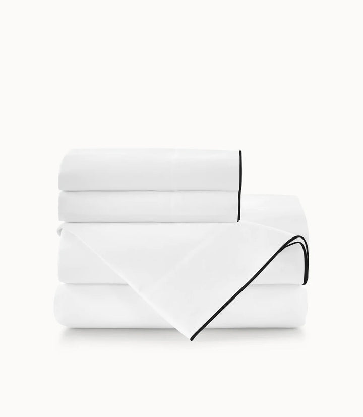 Available in a flat sheet, pillow cases and as a sheet set with coordinating white Soprano fitted sheet.