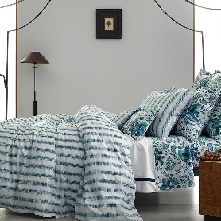A design from Schumacher’s archive becomes an Ikat-style print of soft, colorful stripes on our Luca percale.