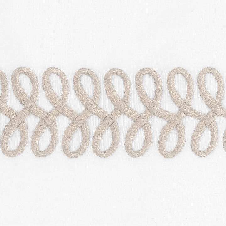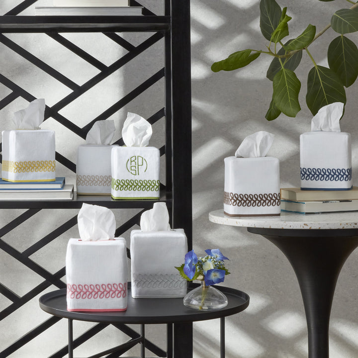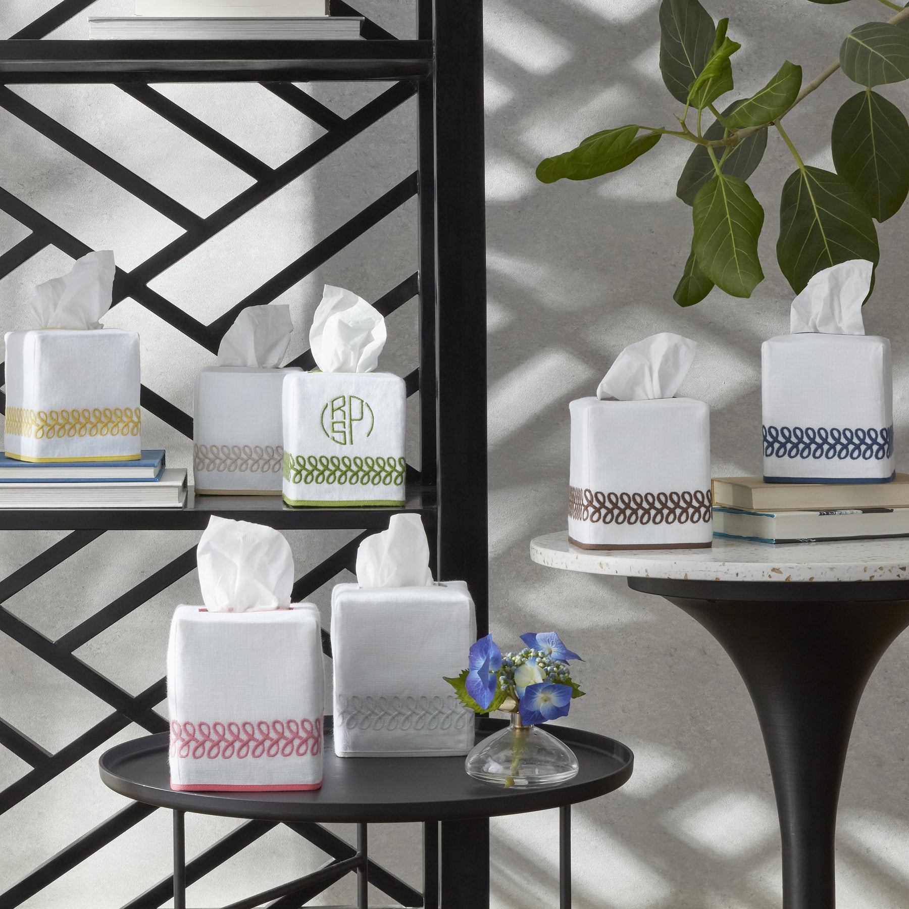 Embroidered on 100% linen, Astor Braid is a style with quintessential appeal. The bold design frpm Schumacher's celebrated collection of tapes and trims is a timeless script, suited for pairing with an array of patterns. Astor Braid Tissue Box Covers feature matching tape on the opening and edge of the cover.