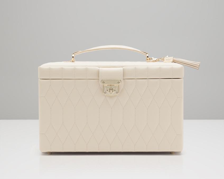 The embodiment of sophistication and style. The Caroline Large Jewelry Case, a timeless classic with elegant soft lines of the 50’s, supple diamond quilted leather accented with gold hardware. This refined case is the perfect home for your precious jewelry and heirlooms.