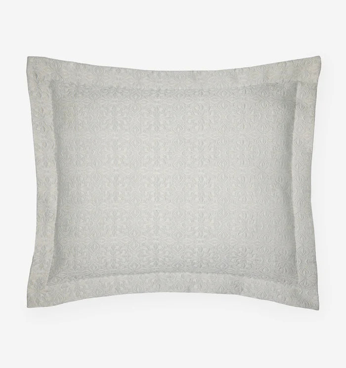 A nod to centuries-old tile motifs, Veroli’s intricate pattern is yarn-dyed and woven in Italy into a soft, lucent, lightweight coverlet and shams.