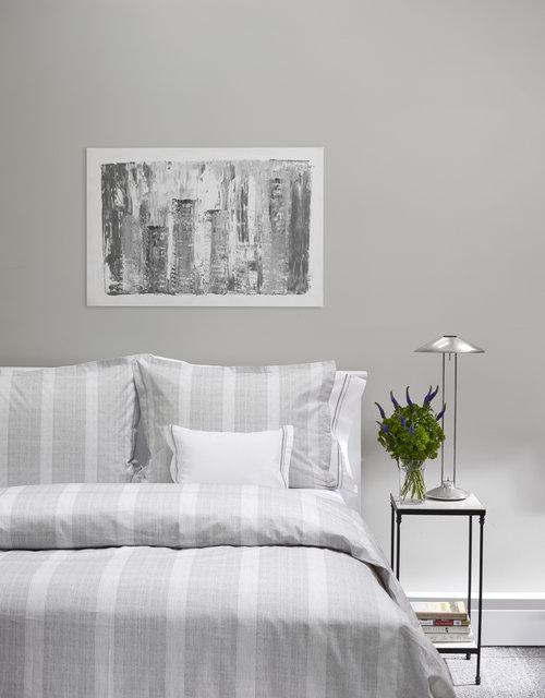 Theo is a neutral stripe pattern printed, in Gray or Natural, on a white background. An updated twist on a textural design, with subtle distressed stripes. Printed on crisp and cool percale, and made to combine well with many decors.