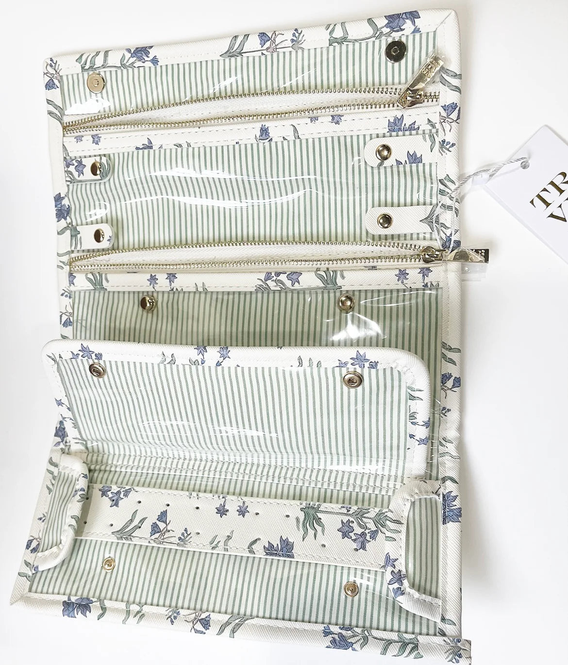 Carry your jewelry in style with our Luxe Provence Jewelry Wallet. Perfect for business or leisure, it features 2 zip pockets, snap tabs for chains, a pendant pouch, and a ring roll and earring bar to keep your valuables secure on-the-go. Stay organized and chic with our sleek and high-functioning design.
