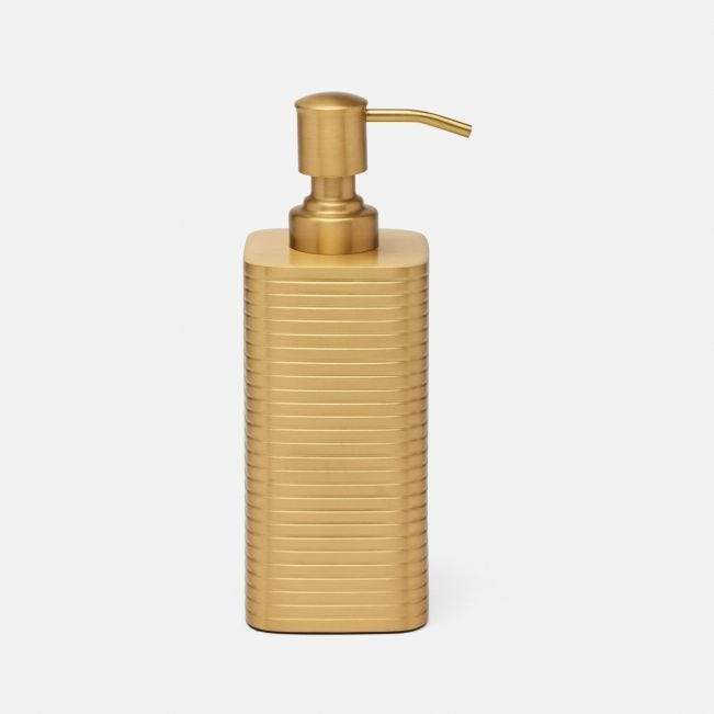This bath collection's textured stripes—crafted from matte metallics over brass—give the bathroom a clean, polished look. Rounded corners enhance the shine of each piece.