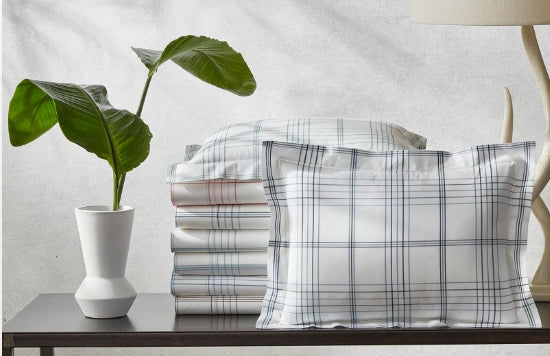 A fresh take on a classic, August Plaid presents an elegant reworking of Schumacher's archive check pattern. Each colorway features two tonal shades finely interwoven in a 500 thread count cotton percale, with a special finish that delivers a remarkably smooth hand-feel. Hemstitch detailing adds a clean, artisanal touch—an elevated style for the modern primary bedroom.