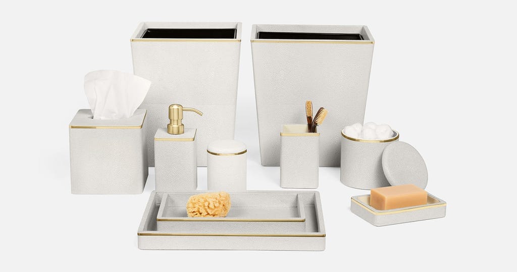 Pairing faux shagreen with delicate gold or silver trim, Bradford elevates the classic bathroom accessory set to peak luxury.