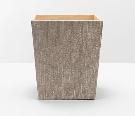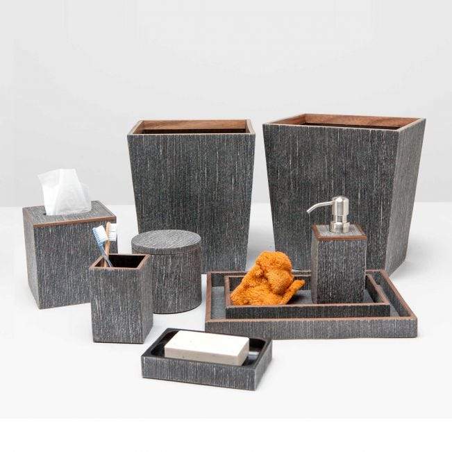 The delicate look of fabric, with the longevity of resin. Our neutral Bruges collection is hand modeled from slubby handloomed silk, adding textural refinement to any bath. Hand-finished with wood trim, the style’s linear pattern is eye-catching on every piece.