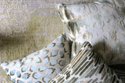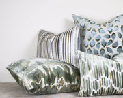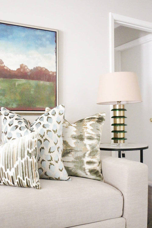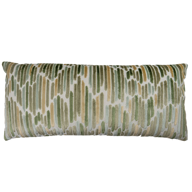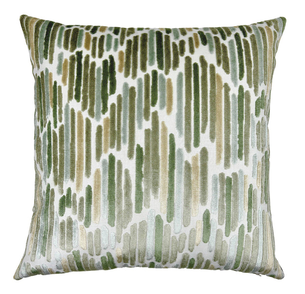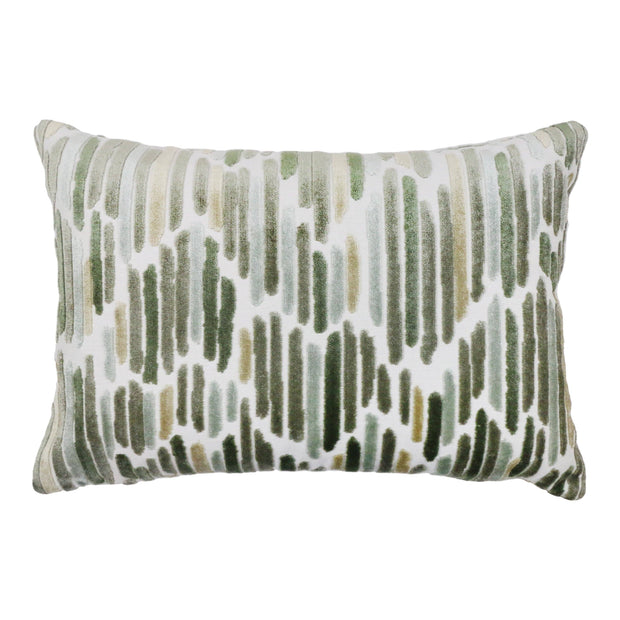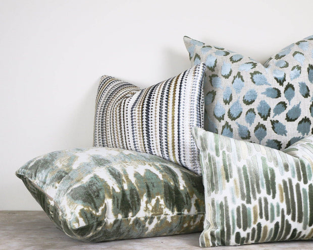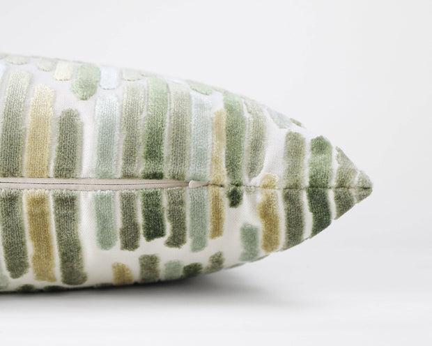 Luxurious, elegant and sophisticated. The perfect accent for any room with its soft, velvety texture and stunning color palette in shades of dusty greens and yellow lines on cut velvet pillow. With an identical front and back, this pillow will look good from any angle.