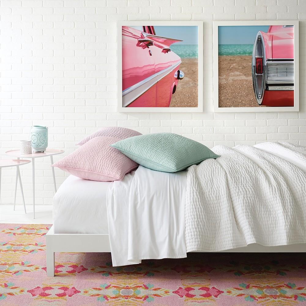 For a mere wispy breath of bedding look no further than this lightweight layer of a quilted cloud. Breezy cotton voile on the front and back plus a thin layer of batting tied together with traditional hand stitched quilting channels creates the perfect spring-into-summer soft and light seasonal covers.