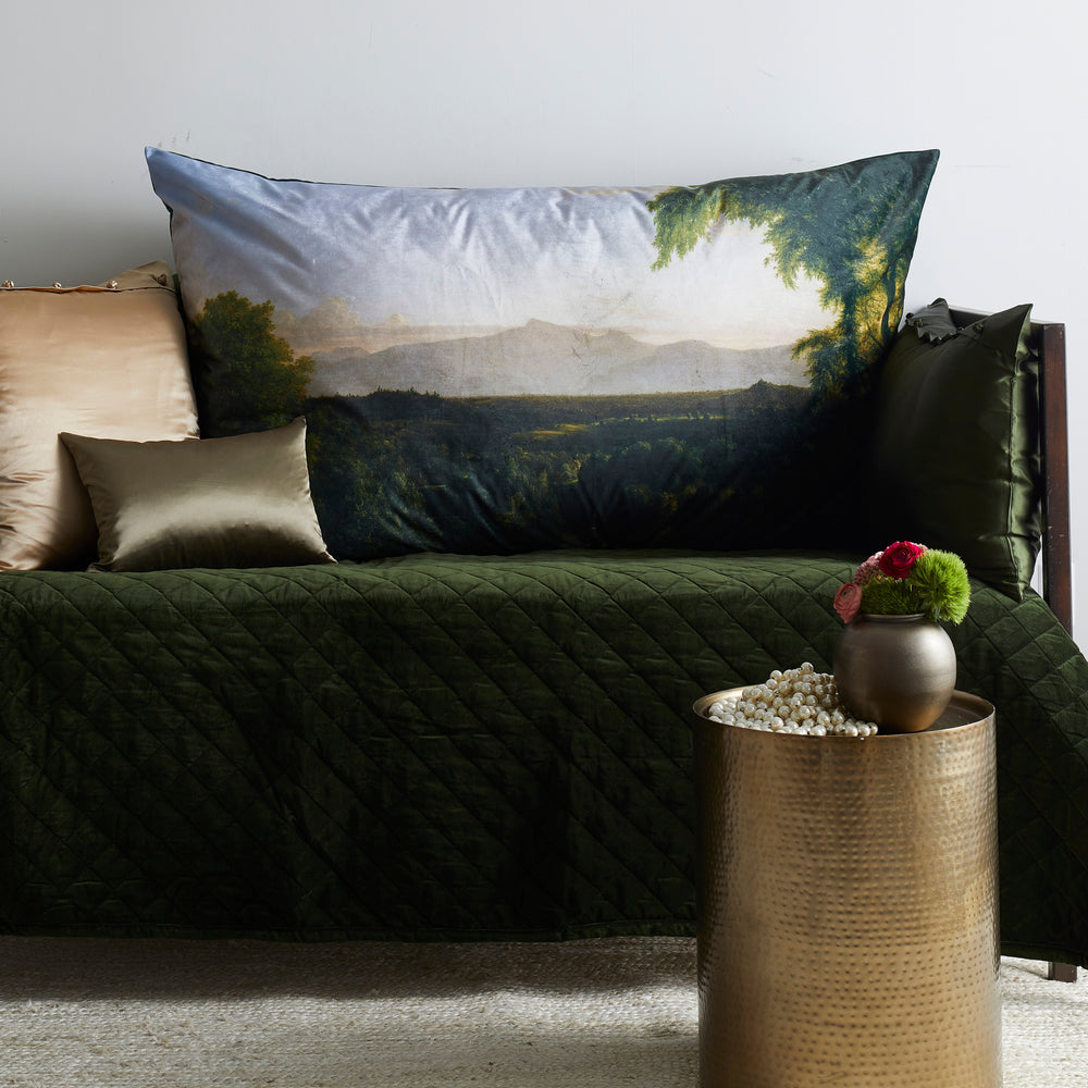 Inspired by the majesty of the Hudson River school paintings, these enormous pillows allow the painting's richness to shine through while eliciting the feeling of viewing the painting by virtue of their enormous size. Made of made in the US of custom printed velvet