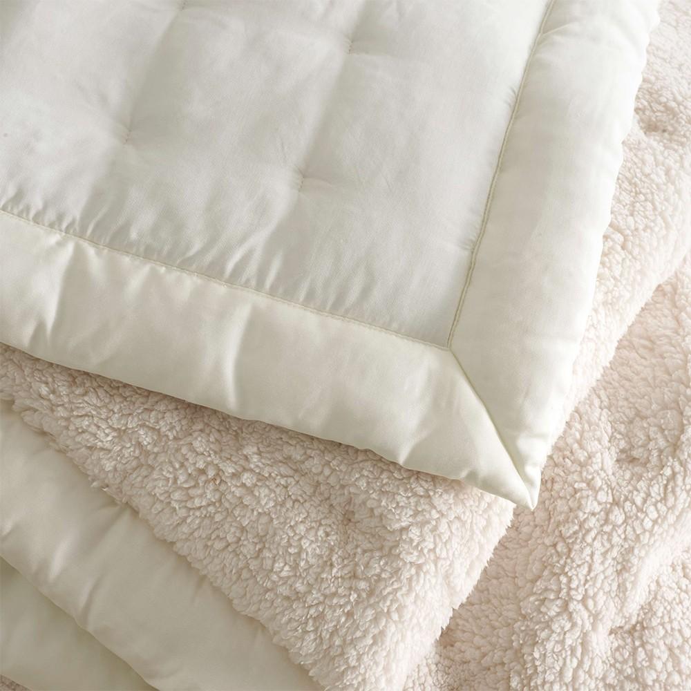100% Polyester. Both sides are fleece. Quilted. Knife edge. Zipper closure. Feather/Down pillow insert included.