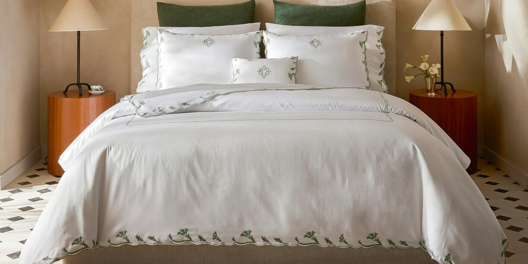 This delicate embroidered collection on luminous Nocturne sateen features elongated, scalloped florals whose tonal shifts lend depth and dimension to this classic look. Without any visible stitching, the trim drapes seamlessly—offering a sense of softness and sophistication to the bed.