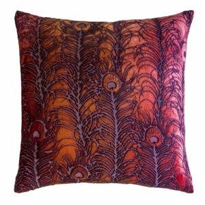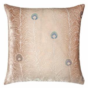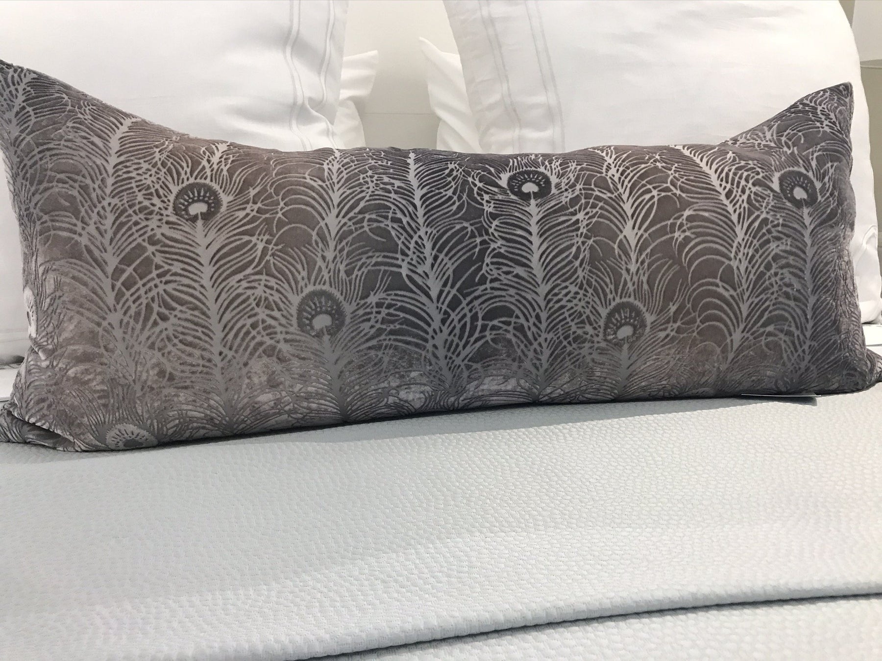 Peacock Feather design is inspired by the opulence of nature. Pattern on front, solid painted velvet back - invisible zipper – comes with feather/down insert – made by people in Philadelphia – products are hand made to order – for swatch requests, please contact us at 704-442-4006