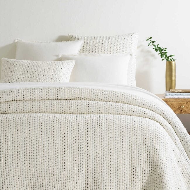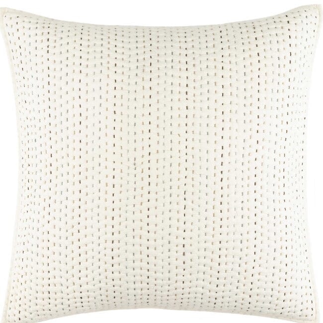 Feel yourself drift away under this gauzy cloudlike dream. A simple quilted sham gets a subtle update with hand-crafted Kantha stitched channels in polychromatic earth tones. The precise stitches add structure and support to the buttery-soft cotton voile, blending the antiqued off-white fabric with cushy batting to deliver year-round warmth and transcendent snuggliness. Designed for us by Marie Flanigan, principal of Marie Flanigan Interiors, reflecting her signature style of timeless elegance and innovative simplicity.