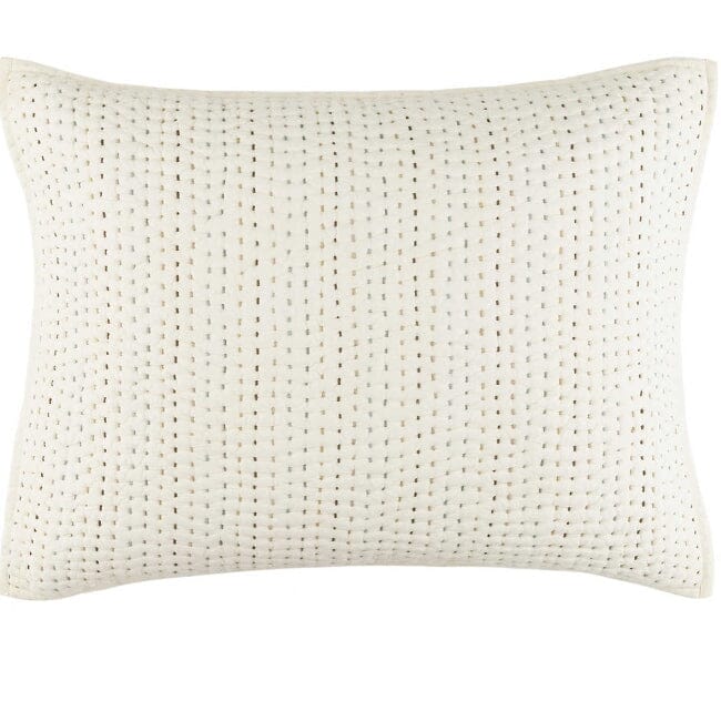 Feel yourself drift away under this gauzy cloudlike dream. A simple quilted sham gets a subtle update with hand-crafted Kantha stitched channels in polychromatic earth tones. The precise stitches add structure and support to the buttery-soft cotton voile, blending the antiqued off-white fabric with cushy batting to deliver year-round warmth and transcendent snuggliness. Designed for us by Marie Flanigan, principal of Marie Flanigan Interiors, reflecting her signature style of timeless elegance and innovative simplicity.