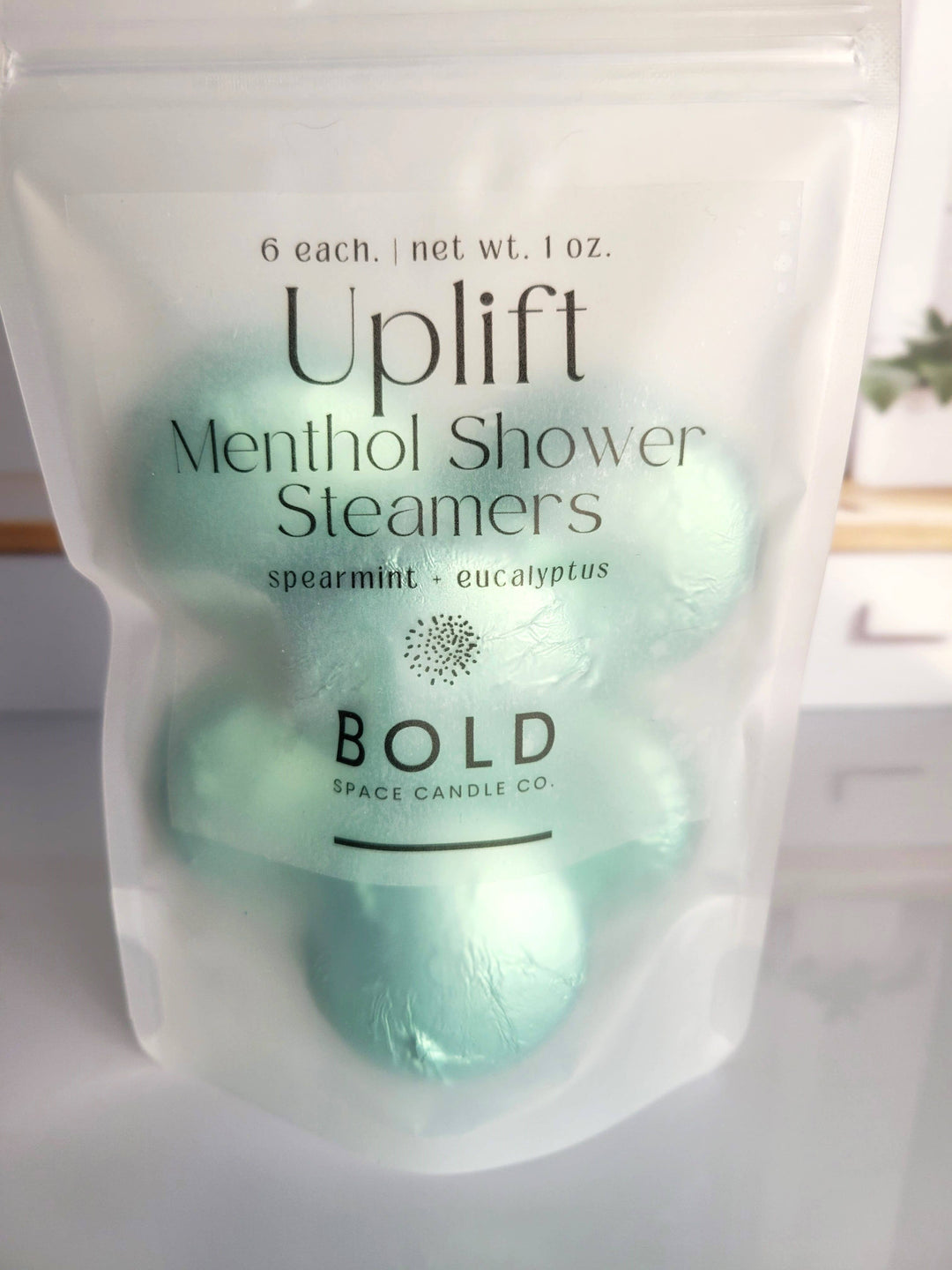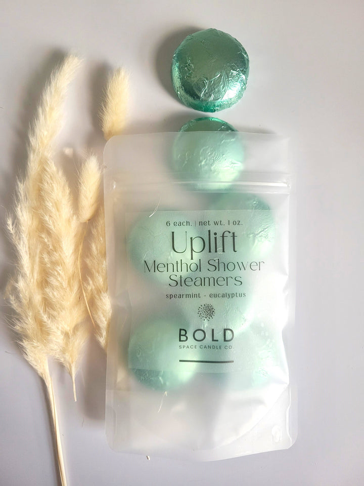 Immerse yourself in a luxurious at-home spa experience with our Uplift Menthol Shower Steamers. Infused with a delightful blend of Spearmint and Eucalyptus essential oils. A simple pick-me-up, these steamers are designed to uplift your mood. Each steamer is carefully handmade and packed with menthol crystals for an enduring scent that lasts throughout your shower.