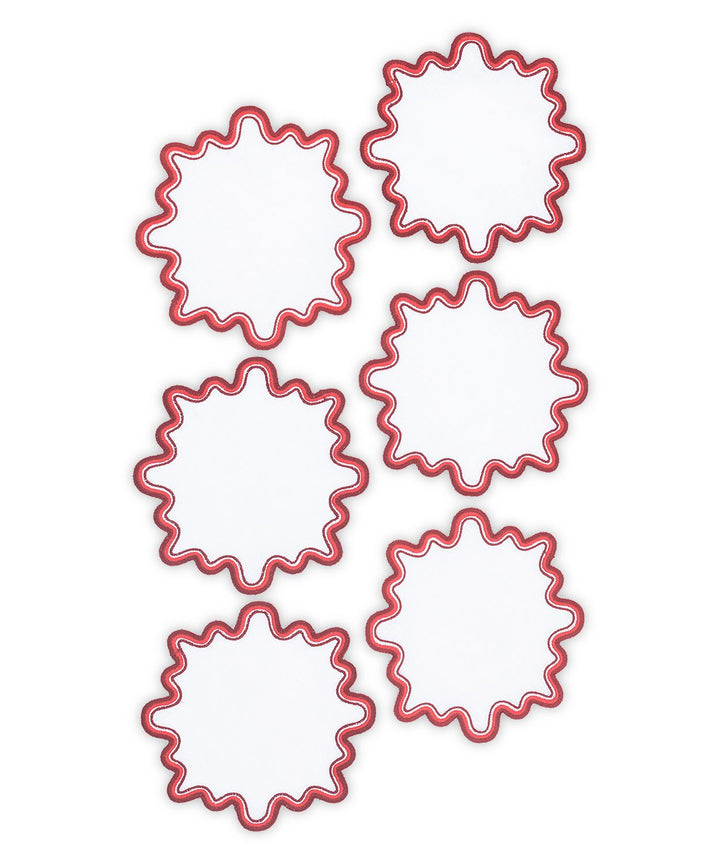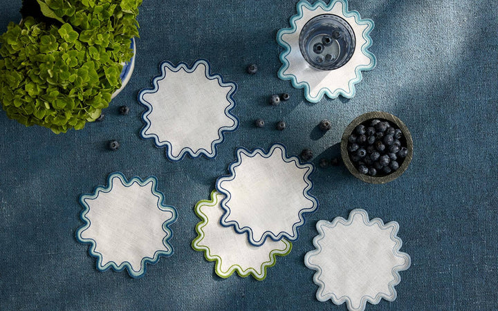 Elevate your entertaining with our Wave Cocktail Napkins. Crafted from luxurious linen, each napkin features a delicate, two-color embroidered border, adding a touch of playfulness to any occasion. Personalize them with a monogram in a variety of thread colors. Perfect for gifting, this set of six will add a splash of "joie de vivre" to any event.